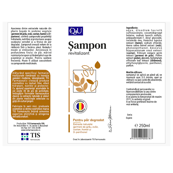 Asocierea dintre extractele naturale din plante bogate în proteine vegetale (germeni de grâu, ovăz, castan, hamei) și D-pantenol, conferă șamponului proprietăți hidratante, nutritive și protectoare asupra scalpului sensibil și a firului de păr degradat.