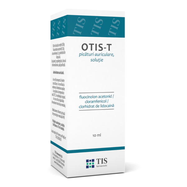 Produsul Otis-T, picaturi auriculare, solutie, este o combinatie de trei substante active (cloramfenicol, fluocinolon si lidocaina) cu actiune antiinflamatorie infectioasa.